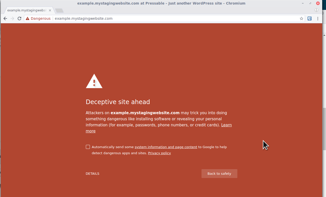 We have recently learned that some staging sites found on the domain mystagingwebsite.com are reported as containing deceptive by Google Chrome and some Chromium-based browsers.